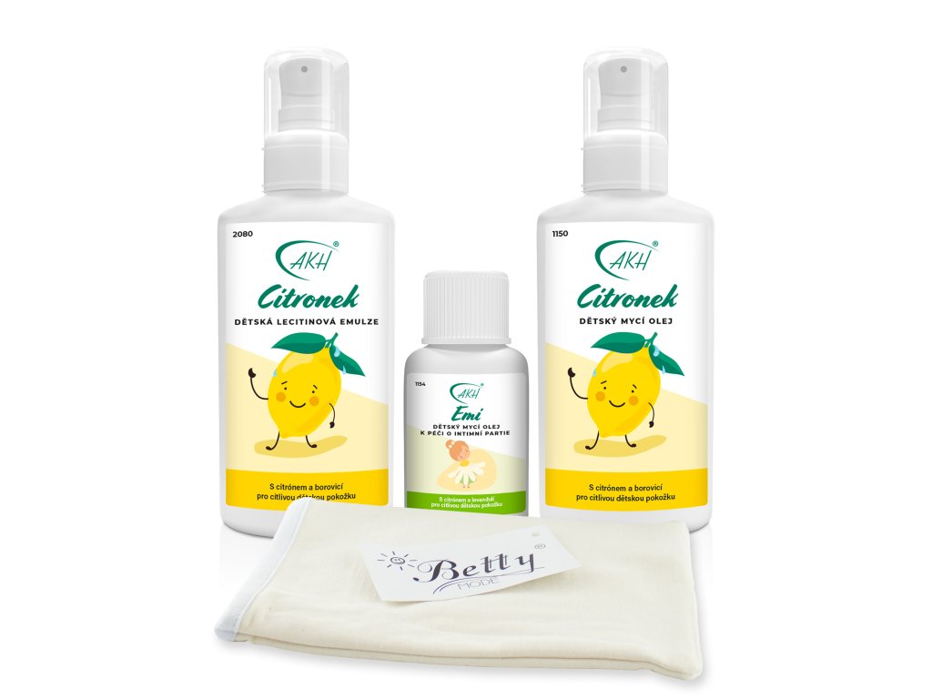 Pro péči o dětskou pokožku s vůní citrónu a borovice. Ve dvou se to lépe táhne, proto jsme pro vás připravili sadu DVOU přípravků pro kompletní péči o dětskou pokožku se svěží vůní CITRÓNU a BOROVICE. Sada obsahuje jemný MYCÍ OLEJ a lehkou LECITINOVOU EMULZI pro následnou péči i o tu nejjemnější pokožku. Dárkem navíc je 20 ml mycího oleje EMI pro intimní hygienu dětí. Líbivé barevné etikety ozdobí a rozveselí každou koupelnu. Jemná citrónová vůně je dětmi oblíbená, pomáhá zlepšovat náladu, soustředění a zároveň je vhodná i při nachlazení. Vůně borovicového jehličí je známá svou schopností posilovat organismus, napomáhat lepšímu dýchání, při nachlazení. Je také účinným pomocníkem při péči o ekzematickou pokožku. Díky balení v dárkové krabičce můžete sadu zvolit i jako praktický dárek pro děti a maminky. Sada obsahuje: 1x 100 ml mycího oleje CITRONEK 1x 100 ml lecitinové emulze CITRONEK 1x 20 ml mycího oleje EMI pro intimní partieDoplňkové parametry