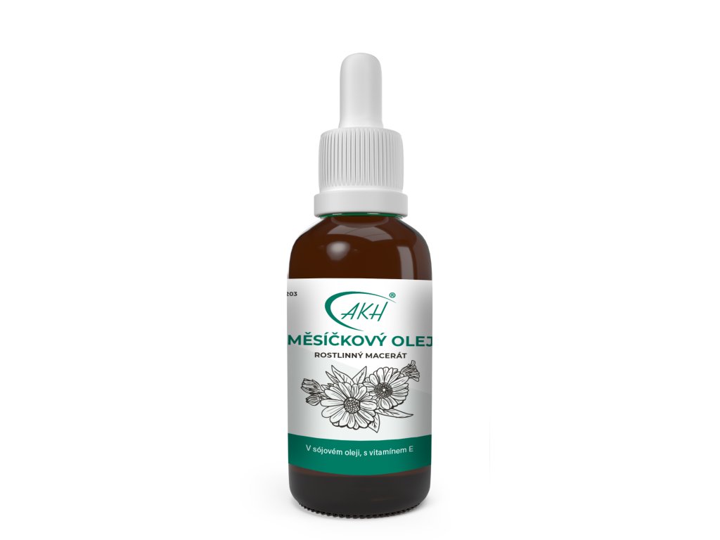 Olej s regeneračními účinky pro citlivou pokožku. Měsíček lékařský je hojně rozšířenou bylinou, která pochází z jižní Evropy a Orientu. U nás se pěstuje téměř 600 let a dříve nechyběl v žádné venkovské zahrádce. Květy měsíčku vložené pod polštář měly zajistit klidné spaní a poházené po podlaze zaháněly noční můry. Pro použití v kosmetice je výbornou surovinou měsíčkový olej. Olejovy macerát je vyluh rostliny v oleji, do kterého z ní přechází účinné lipofilní látky. Jako nosný byl zvolen sójový olej, který vyniká svou stabilitou. V aromaterapii jsou maceráty jedinečnou a neodmyslitelnou součástí masážních a regeneračních olejů, krémů, balzámů a mastí. INCI: Calendula officinalis Flower Oil, Glycine soja Oil, Tocopherol Fyzikální vlastnosti: čirá, žlutá až oranžová olejovitá kapalina. Získává se macerací okvětních lístků měsíčku lékařského v sojovém oleji. Bod tuhnutí: pod - 8 °C Relativní hustota: při 20 °C cca 0,92 g/cm3Doplňkové parametry