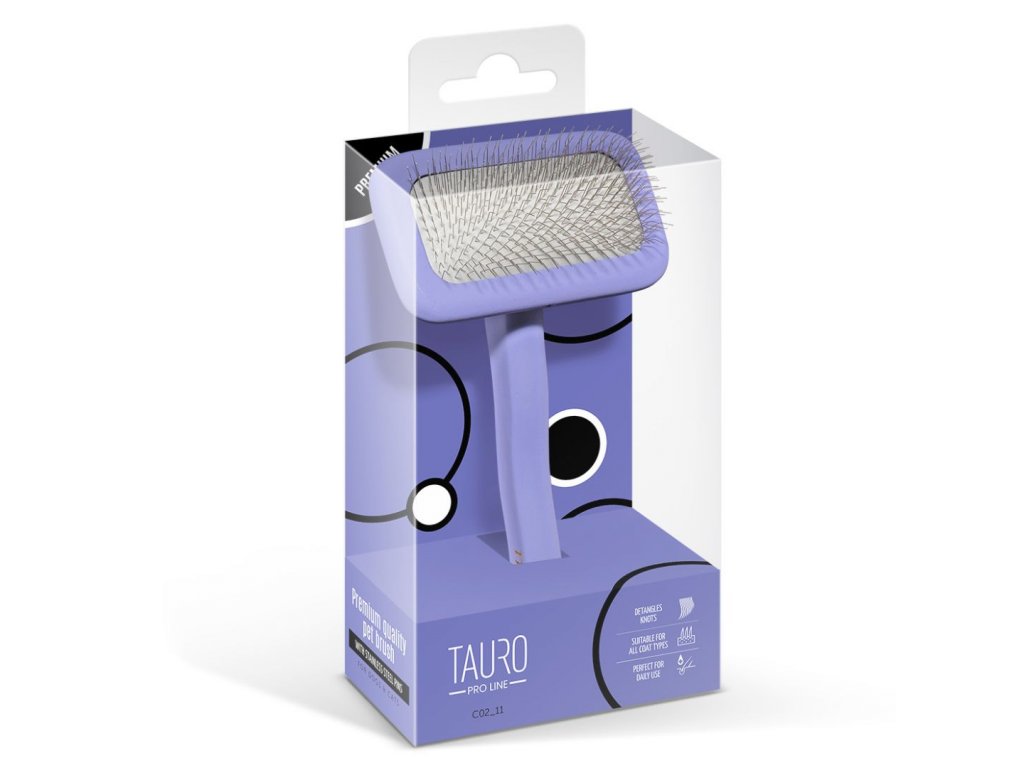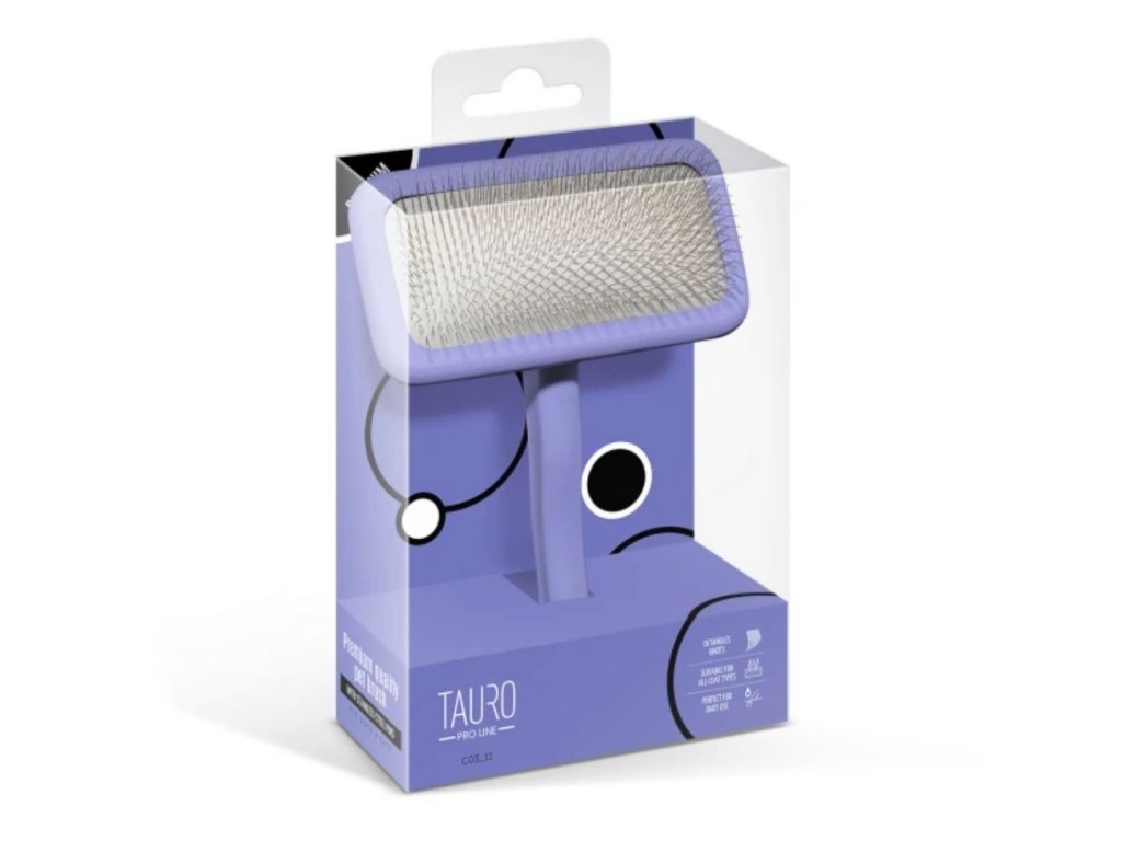 Profesionální dřevěný kartáč Tauro Pro Line je určen pro efektivní péči o kočky a psy. Podložka, ze které vychází drátky, je měkká a elastická a jemně se přizpůsobí křivkám těla zvířete, aniž by dráždil kůži. Rukojeť kartáče se pohodlně drží a neklouže z ruky, takže si při kartáčování svého mazlíčka nebudete namáhat zápěstí. Drátky jsou odolné a velmi měkké, s úhlem zakřivení, který zabraňuje poškrábání kůže zvířete a činí srst měkkou a nadýchanou. Speciální antistatický povlak zabraňuje hromadění elektrického náboje srsti, což usnadňuje rozčesávání srsti a zanechává ji hladkou a lesklou. Kartáč Tauro Pro Line mohou používat jak profesionální chovatelé zvířat, tak majitelé, kteří respektují srst a kůži svého mazlíčka. Vlastnosti: Velikost S - Celkové rozměry: 6,8x14,8 cm. Délka drátků – 11 mm. --- Velikost M - Celkové rozměry: 9,2x17 cm. Délka drátků – 11 mm. --- Velikost L - Celkové rozměry: 12x17,8 cm. Délka drátků – 11 mm. Barva kartáče: fialová. Barva podložky: šedá.Doplňkové parametry