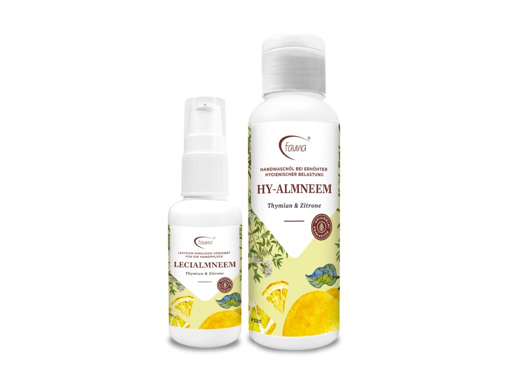 Sada pro péči o ruce při zvýšené hygienické zátěži, přípravek podporující pokožku. Ve dvou se to lépe táhne, proto jsme pro vás do organzového sáčku připravili sadu dvou přípravků pro kompletní péči o ruce při zvýšené hygienické zátěži. Sada obsahuje mycí olej HY-ALMNEEM s tymiánem a citronem a jemnou lecitinovou emulzi LECIALMNEEM pro následnou péči i o tu nejjemnější pokožku. 50 ml balení lecitinové emulze je ideálním balením do kabelky a na cesty. Líbivé barevné etikety ozdobí a rozveselí každou koupelnu. Sada obsahuje: 1x 100 ml mycího oleje HY-ALMNEEM 1x 50 ml lecitinové emulze LECIALMNEEMDoplňkové parametry