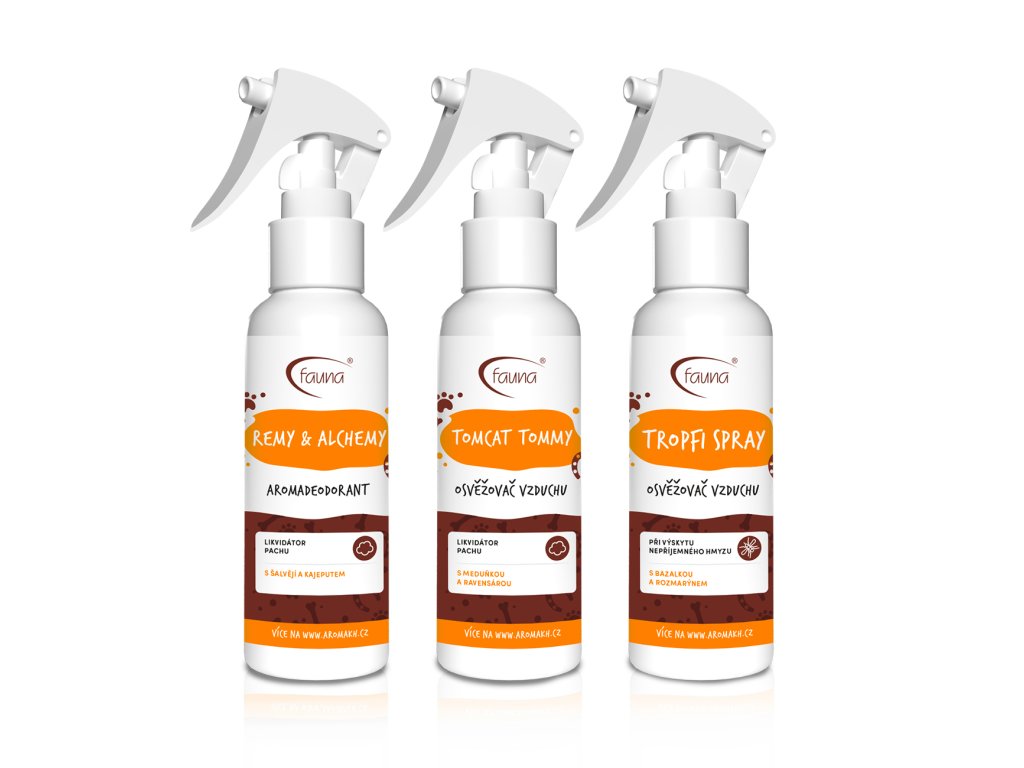 Sada obsahující aromadeodoranty a likvidátory pachu TOMCAT TOMMY, REMY&ALCHEMY a hmyz odpuzující TROPFI SPRAY. TOMCAT TOMMY 100 ml &ndash Přípravek v rozprašovači vhodný k likvidaci nepříjemných pachů zvířat, k ošetření zvířecích záchodků, pelíšků, kotců atd. Pomůže udržovat domácnost svěží a vonící. TROPFI SPRAY 100 ml &ndash Přípravek obsahuje éterické oleje z bazalky, citronely a máty, které odpuzují hmyz a povrchové parazity. Máta je známá svými osvěžujícími až ochlazujícími účinky. Bazalka a elemi napomáhají zklidnění při stresu, tymián a rozmarýn podpoří obranyschopnost organismu. REMY&ALCHEMY 100 ml &ndash Přípravek vhodný k likvidaci nepříjemných pachů drobných zvířat. Klece, zvířecí záchody udržuje mikrobiálně čisté díky lihu a éterickým olejům.Doplňkové parametry