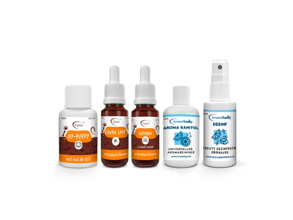 Startovací sada s voňavými a jemnými přípravky pro štěňata, koťata a malá zvířata. Nevíte si rady, které z přípravků AROMAFAUNY vybrat pro péči o štěně, kotě či jiné mládě? Připravili jsme pro vás výběr přípravků, které Váš mazlíček do začátku potřebuje. Sada obsahuje 5 produktů k základní péči o štěně v testovacích velikostech. HY-PUPPY 20 ml – mycí olej vhodný především na mytí mladé srsti štěňat, koťat apod. FAUNA SPOT 10 ml – speciální přípravek s možným odpuzujícím účinkem při výskytu klíšťat, blech a hmyzu. PAPENDO 10 ml - dietetický veterinární přípravek vhodný k podpoře trávení. AROMA SANITOL 20 ml – čisticí přípravek s jemnou vůní pomerančů, který provoní vaši domácnost a udrží ji čistou. DESINF 20 ml – dezinfekční přípravek s osvěžující vůní tymiánu vhodný především k ošetřování pelíšků, koberců či textilních hraček.Doplňkové parametry
