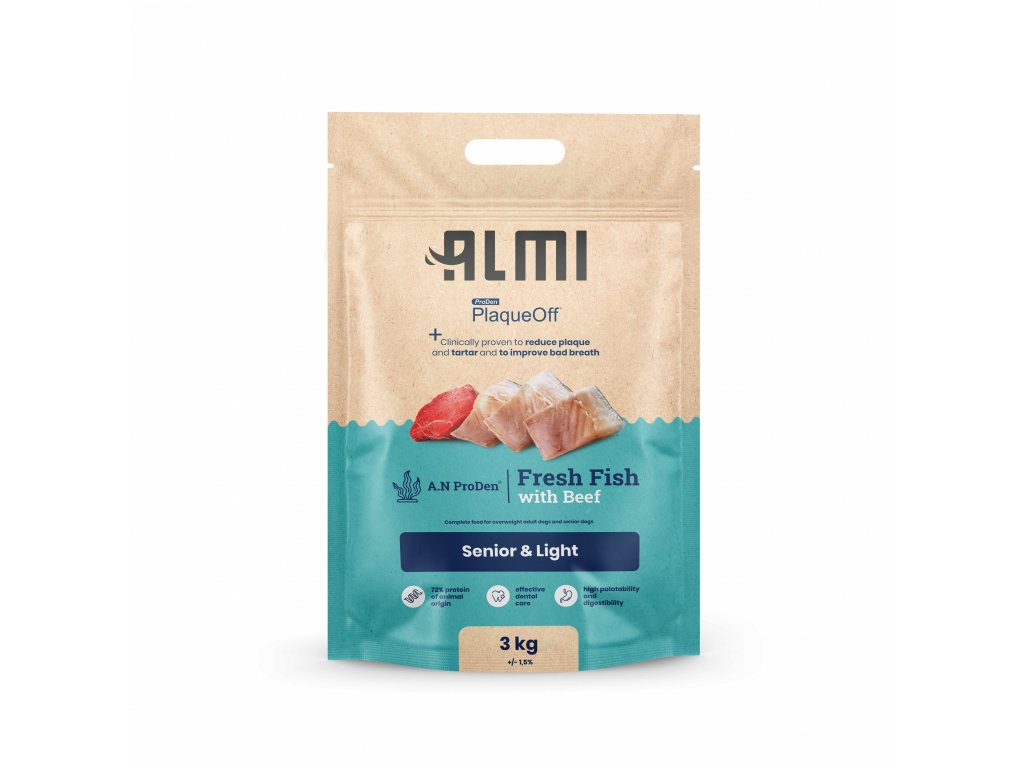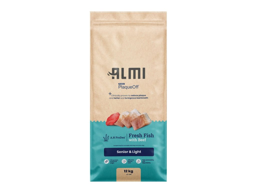 Díky pečlivě zvolenému složení granulí ALMI bude Váš pes prospívat. Kromě čerstvého rybího a hovězího masa, které je zdrojem bílkovin pro posílení svalů, obsahuje také rýži. Ta psa zasytí a tím zabraňuje jeho přejídání a přibývání na váze. Kromě toho podporuje dobrý zdravotní stav a celkovou pohodu. Granule ALMI jsou obohacené o PlaqueOff™, u kterého je klinicky prokázáno, že snižuje zubní plak, zubní kámen a zlepšuje špatný dech.