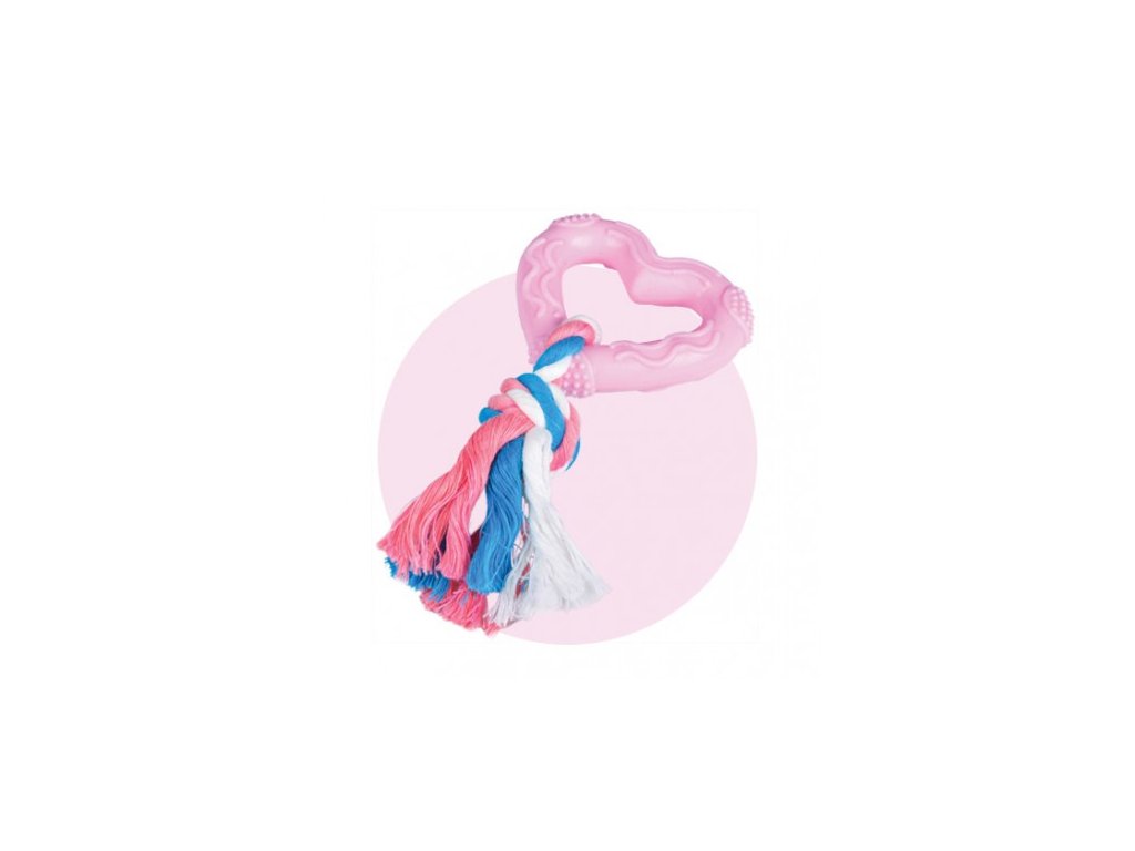 Hračka pro šťěňata růžové srdce s lanem 15 cm. Ideální pro štěnata, na kousání a zabavení.Doplňkové parametry