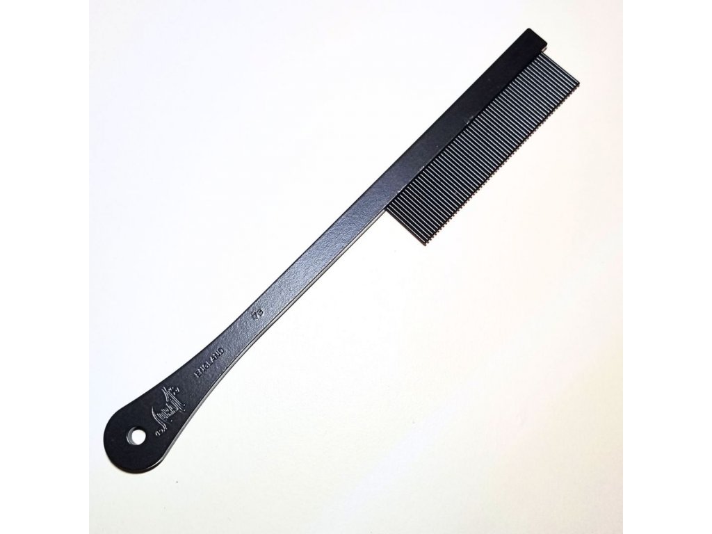 Hřeben černý dlouhý - extra jemný. Velmi pevný hřeben známé anglické značky Spratts. Hřeben je potažený teflonem, krásně klouže srstí a je antistatický. Je výborně vyvážený a skvěle se drží. celková délka hřebenu 18,5cm délka rukojeti 10,5cm délka česací části 7,5cm délka zubů 1,5cm váha 73gDiskuze