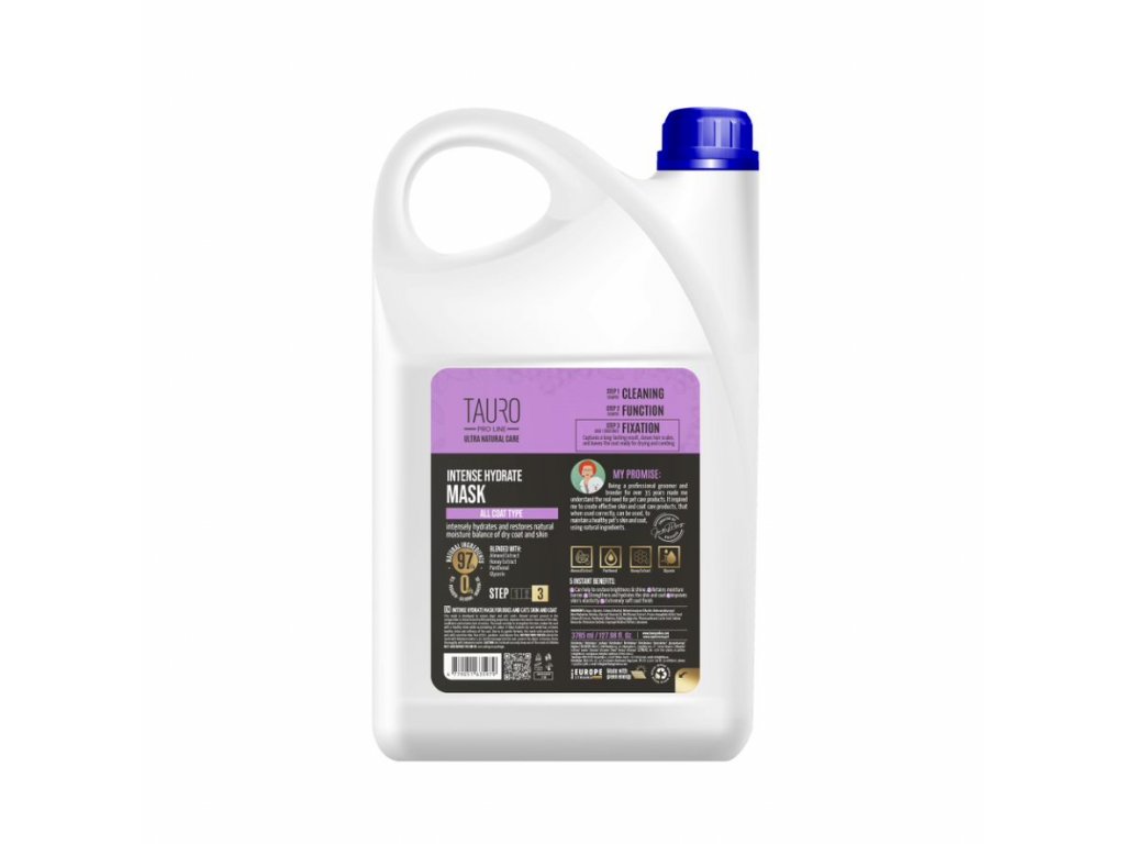 Intenzivní hydratační maska s nejkvalitnějšími ingrediencemi a mandlovým extraktem, určená pro posílení srsti, hloubkovou hydrataci pokožky a srsti, dodání lesku a zvýraznění barvy. Maska je krok 3 - fixace - v systému tří kroků: srst je kondicionována, výsledek je fixován a vlhkost srsti a kůže je udržována. Obsahuje mandlový extrakt ve složení má hydratační vlastnosti, zlepšuje bariérovou funkci pokožky, upravuje a obnovuje vlasovou strukturu. Výtažek z mandlí navíc pokožku mazlíčka dokonale hydratuje a příjemně voní. Výrobek obsahuje panthenol. Je to forma vitamínu B5, která je široce používána jako přísada do produktů péče o pleť i vlasy. Srst se díky němu snadno rozčesává, je hebká a získává zdravý lesk. Maska s hydratačními a regeneračními vlastnostmi je perfektní pro odstranění zacuchání. Díky jemnému složení je maska ideální pro domácí mazlíčky s citlivou pokožkou: produkt je vyroben bez SLS, parabenů, minerálních olejů a silikonů. Podmínky skladování: šampon skladujte při pokojové teplotě mimo dosah dětí. Vyrobeno v Evropské unii. Množství 400ml, 1000ml, 3785ml.Doplňkové parametry
