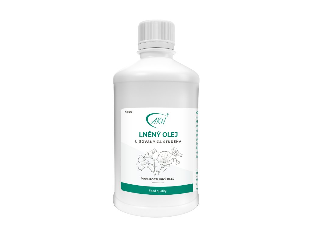 Olej ořechovo-máslové chuti pro doplnění stravy o nenasycené mastné kyseliny. Olej má jemnou ořechovo-máslovou příchuť, lze ho přidávat do salátovych zálivek nebo jím zakapávat pokrmy. Jedná se o vysychavý olej sytě žluté až oranžové barvy. Olej je získáván lisováním z lněných semen. Pro organismus je zádsadní svým vysokým obsahem esenciálních mastných kyselin (kyseliny linolové a alfa-linolenové), lecitinů, vitamínů a dalších antioxidantů. Lněný olej je velmi náchylný k oxidaci, jejímž následkem přichází o cenné složky. Žluklý olej mění svou chuť na nepříjmeně hořkou. Je proto nutné jej uchovávat v chladu a temnu. INCI: Linum usitatissimum Seed Oil Fyzikální vlastnosti: zelenožlutý až tmavě zelený vysychavý olej. Bod tuhnutí: cca -23 °C Relativní hustota: při 20 °C cca 0,929 g/cm3 Základní obsahové složky: nenasycené mastné kyseliny, zejména kyselina alfa-linolenová (C18:3) cca 35-71 %, linolová (C18:2) cca 10-20 % a olejová (C18:1) cca 13-35 % lecitin, vitamíny, nasycené mastné kyseliny: stearová 2-9 % a palmitová 3-10 %Doplňkové parametry