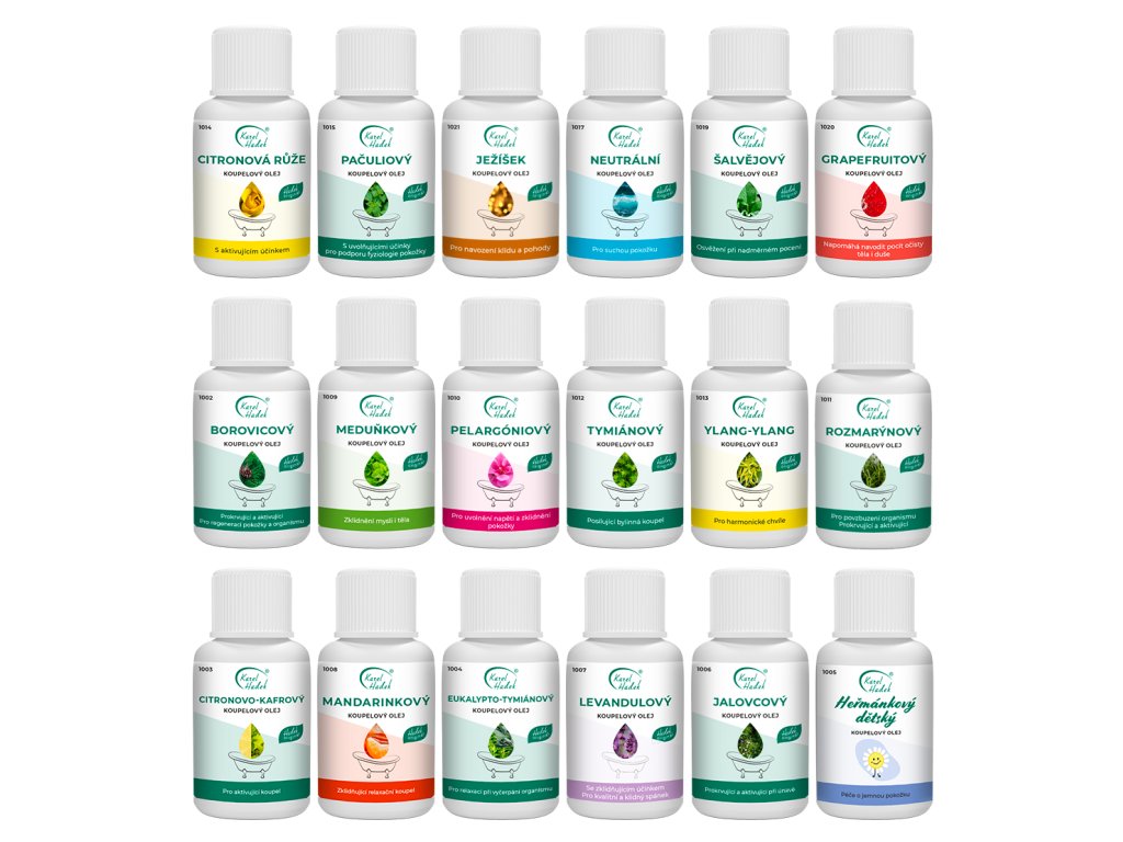 Sada koupelových olejů 18x20 ml. Pro ulehčení výběru jak v oblasti vůně, tak i snášenlivosti aromaterapeutických účinků, nabízíme sadu testerů koupelových olejů Karel Hadek, která se osvědčila i jako vynikající dárek. Obsahuje testery všech koupelových olejů, což umožňuje vyzkoušet a vybrat si ty nejvhodnější. Jednotlivá balení mají obsah 20 ml a vystačí na jednu až dvě koupele. Kafrový – pro obsah kafru doporučujeme nepoužívat v těhotenství Jalovcový/ Tymiánový – Nepoužívat bez konzultace s lékařem v těhotenství, v období kojení, u malých dětí a při epilepsii. Rozmarýnový – Bez konzultace s lékařem nepoužívat v těhotenství, při epilepsii. Nevhodný pro osoby s vysokým krevním tlakem. Pro jeho silně povzbuzující účinky nedoporučujeme používat před spaním. Složení sady: BOROVICOVÝ, CITRONOVO-KAFROVÝ, EUKALYPTO-TYMIÁNOVÝ, GRAPEFRUITOVÝ, HEŘMÁNKOVÝ, JALOVCOVÝ, LEVANDULOVÝ, MANDARINKOVÝ, MEDUŇKOVÝ, NEUTRÁLNÍ, PAČULIOVÝ, PELARGÓNIOVÝ, ROZMARÝNOVÝ, ŠALVĚJOVÝ, TYMIÁNOVÝ, YLANG-YLANG, Z CITRONOVÉ RŮŽE, JEŽÍŠEKDoplňkové parametry