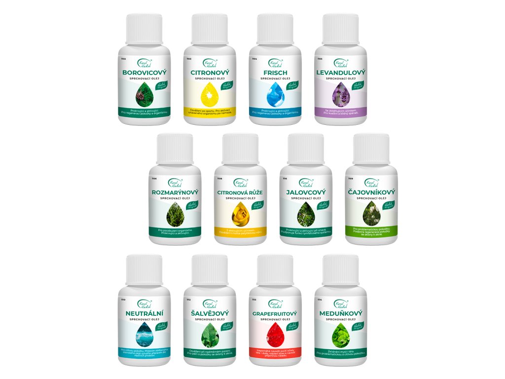 Dárkové balení sprchovacích olejů 12x20 ml. Pro ulehčení výběru jak v oblasti vůně, snášenlivosti, tak i aromaterapeutických účinků nabízíme sadu testerů sprchovacích olejů, která se osvědčila i jako vynikající dárek. Obsahuje testery všech sprchovacích olejů, což umožňuje vybrat a vyzkoušet si ty nejvhodnější. Jedno balení o obsahu 20 ml vystačí na až 20 osprchování. Upozornění: Přípravky obsahující mátu, eukalyptus a mentol nejsou vhodné pro děti do 3 let! Šalvějové přípravky nelze používat v průběhu těhotenství a kojení. Snižují, až zastavují tvorbu mateřského mléka! Složení sady: CITRONOVÝ, ČAJOVNÍKOVÝ, FRISCH, GRAPEFRUITOVÝ, JALOVCOVÝ, LEVANDULOVÝ, MEDUŇKOVÝ, NEUTRÁLNÍ, ROZMARÝNOVÝ, ŠALVĚJOVÝ, BOROVICOVÝ, Z CITRONOVÉ RŮŽE INCI: Je součástí každého jednotlivého balení.Doplňkové parametry