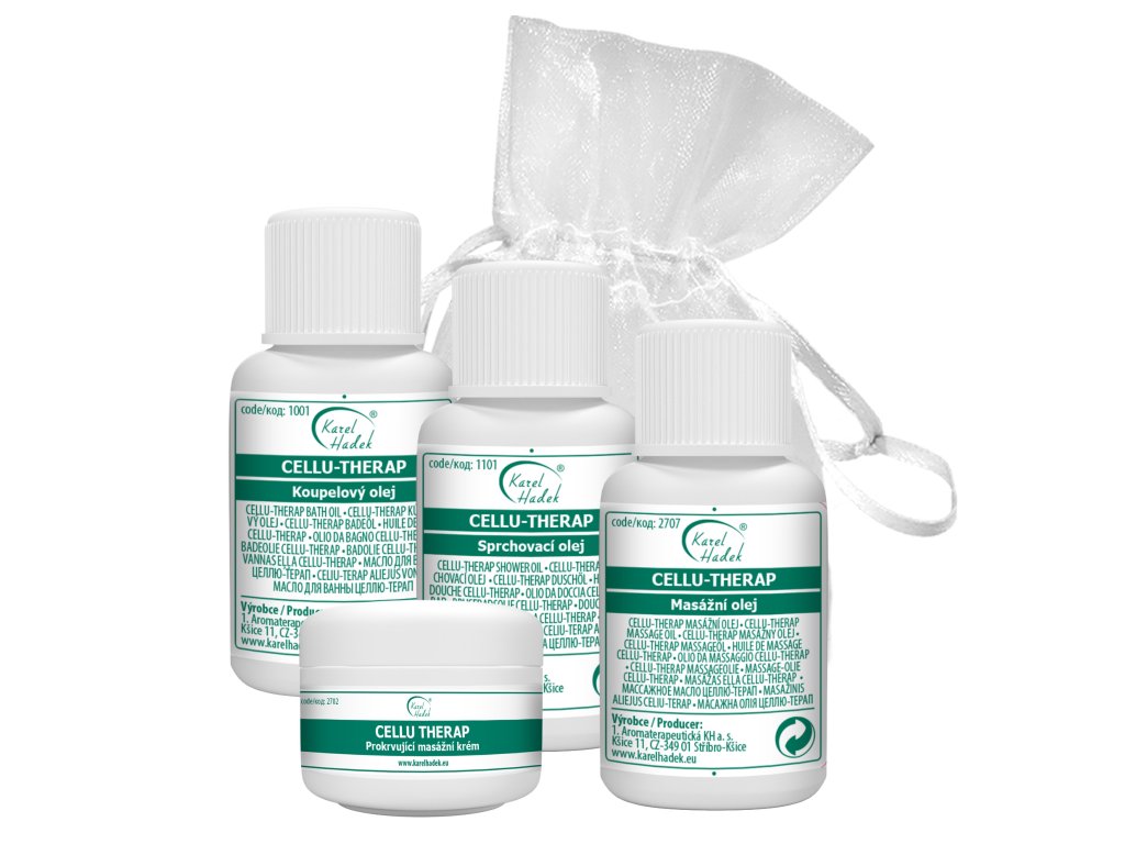 Sada přípravků pro péči o tělo při výskytu celulitidy. Vyzkoušejte přípravky pro kompletní péči o kůži s celulitidou. Nápomocny v boji s touto nepříjmeností vám budou následující produkty: Koupelový olej CELLU-THERAP (20 ml) Sprchovací olej CELLU-THERAP (20 ml) Masážní olej CELLU-THERAP (20 ml) Prokrvující masážní krém CELLU-THERAP (5 ml)Doplňkové parametry