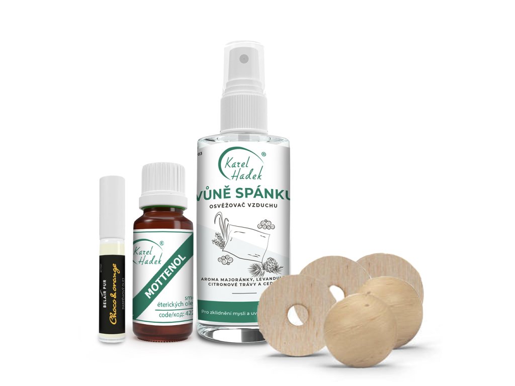 Sada přípravků vhodných k provonění domácnosti a nastolení harmonického prostředí. K příjemně vonící domácnosti plné pohody a harmonie vám pomohu naše přípravky vyrobené z éterických olejů. VŮNĚ SPÁNKU (100 ml) Přípravek pro provonění místnosti, na podporu dobrého spánku. Obsažené éterické oleje z MAJORÁNKY, LEVANDULE, CITRONOVÉ TRÁVY a CEDRU napomáhají zklidnění, uvolňování napětí a tím mohou podporovat kvalitní spánek. MOTTENOL (10 ml) Směs éterických olejů jemné vůně navozující pozitivní náladu, složená z olejů z POMERANČE, CEDROVÉHO DŘEVA, LAVANDÍNU, LITSEY CUBEBY, TYMIÁNU a HŘEBÍČKU. Příjemně provoní nejen skříň, ale i domácnost nebo kancelář. Použité oleje jsou známé svým účinkem na obtížný hmyz, mezi který patří i mol šatní. Tuto směs éterických olejů jistě oceníte, i pokud se u vás mol šatní nevyskytuje. V sadě jsou dřevěné předměty určené k aplikaci směsi MOTTENOL 3 dřevěné kroužky k zavěšení na ramínko a 2 dřevěné koule k umístění mezi oblečení. Sada obsahuje malý dárek parfém ČOKOLÁDA - POMERANČ.Doplňkové parametry