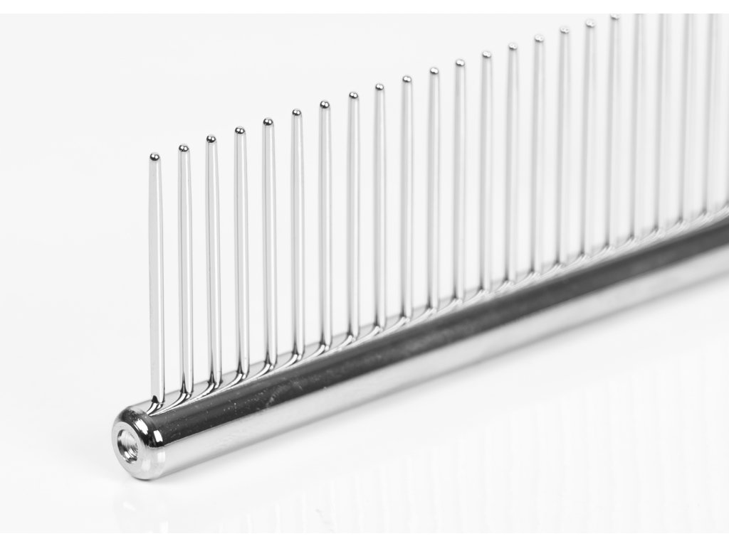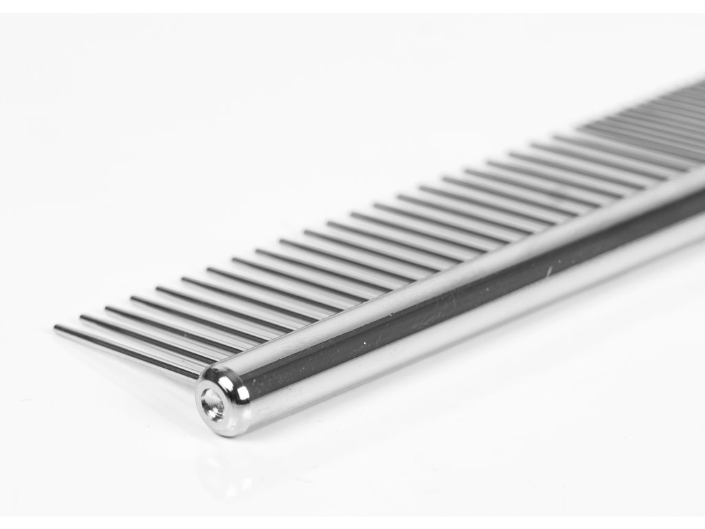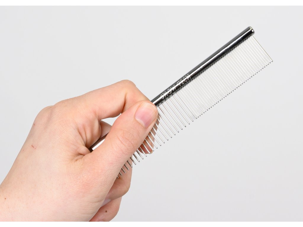 Jak již většina psích kadeřníků ví, pro různé typy srsti jsou potřeba různé typy hřebenů. Podobně různé hřebeny vytvářejí různé povrchové úpravy. Je nezbytné mít po ruce dobrý výběr, který bude vyhovovat každému psovi, který projde dveřmi. Chcete-li mít jistotu, že máte kvalitní hřebeny, které vám poskytnou požadovaný výsledek a které klouzají po chlupech, aniž by se psovi zadrhávaly nebo způsobovaly nepohodlí. Zde se hodí hřeben Show Tech Combi! Tento prémiový kombinovaný hřeben je ideální pro všechny menší části těla psa, ideální pro detailní práci kolem očí nebo uší a také pro celkovou úpravu miniaturních plemen. Pro Combi Comb je standardní, přesto robustní a pevný, celokovový hřeben na stříhání psů s 1,9 cm dlouhými, kuželovitými zuby. Každý zub je silný a hladký. Díky ideální tloušťce je tento hřeben nezbytností! Další výhodou je, že hroty se zaoblenou špičkou umožňují česání bezpečně bez zranění psa. Vzhledem k tomu, že zuby jsou kónické a na špičce o něco jemnější, je mnohem snazší proniknout skrz a hluboko do jakékoli srsti, dokonce i té hustější, a blízko kůže. Zuby jsou vyrobeny z vysoce kvalitní, pevné a odolné oceli s hladkým a hustým, vysoce chromovaným povrchem, aby hřeben snadno klouzal po srsti. Protože se hřeben Pro Combi skládá ze dvou částí, z nichž jedna má jemnější rozteč zubů a druhá širší, máte vždy po ruce dva typy hřebenů (jemný a hrubý). A co víc, díky zaoblené hřbetu hřebenu se Pro Combi velmi snadno zvedne z česacího stolu a navíc se pohodlně drží při rozčesávání srsti psa nebo dokonce pro načechrání a konečnou úpravu. Vše je v detailech! - Ideální pro česání menších částí těla nebo menších plemen psů a pro jemné nebo detailní práce - Vhodné i pro kočky, koně, králíky a další domácí mazlíčky - Hřbet: mosaz s chromovou úpravou - Zuby: vysoce kvalitní, pevná a odolná ocel s chromovou úpravou - Vícenásobné použití: kombinace jemných a hrubých zubů se zaoblenou špičkou - Rozteč mezi zuby jemná část 0,3 mm - Rozteč mezi zuby hrubá část 1,6 mm - Délka hřebenu : 11,5 cm - Délka zubů: 1,9 cm - Šířka zubů: 1 mm - Hmotnost: 27 g* - Zaoblený hřebenový hřbet * Všechny míry jsou přibližné. Návod k použití: Pro každodenní rozčesávání menších partií jako jsou vousy, uši, pod očima... Nejprve jemným kartáčem a poté širokou stranou tohoto hřebenu vlasy opatrně pročesejte po směru růstu srsti. Vždy začínejte od konečků a pak postupně jděte hlouběji, dokud je nebudete moci vyčesat až ke kořínkům chlupů. Poté vyměňte strany otočením hřebenu a znovu pročešte jemnou stranou. Pečlivým odstraněním odumřelých a uvolněných chlupů ze srsti se bude váš pes v první řadě cítit dobře a bude méně chlupů ve vašem domě, na vašem oblečení atd. Může být také použit česání za účelem vytvoření extra objemu.Doplňkové parametry