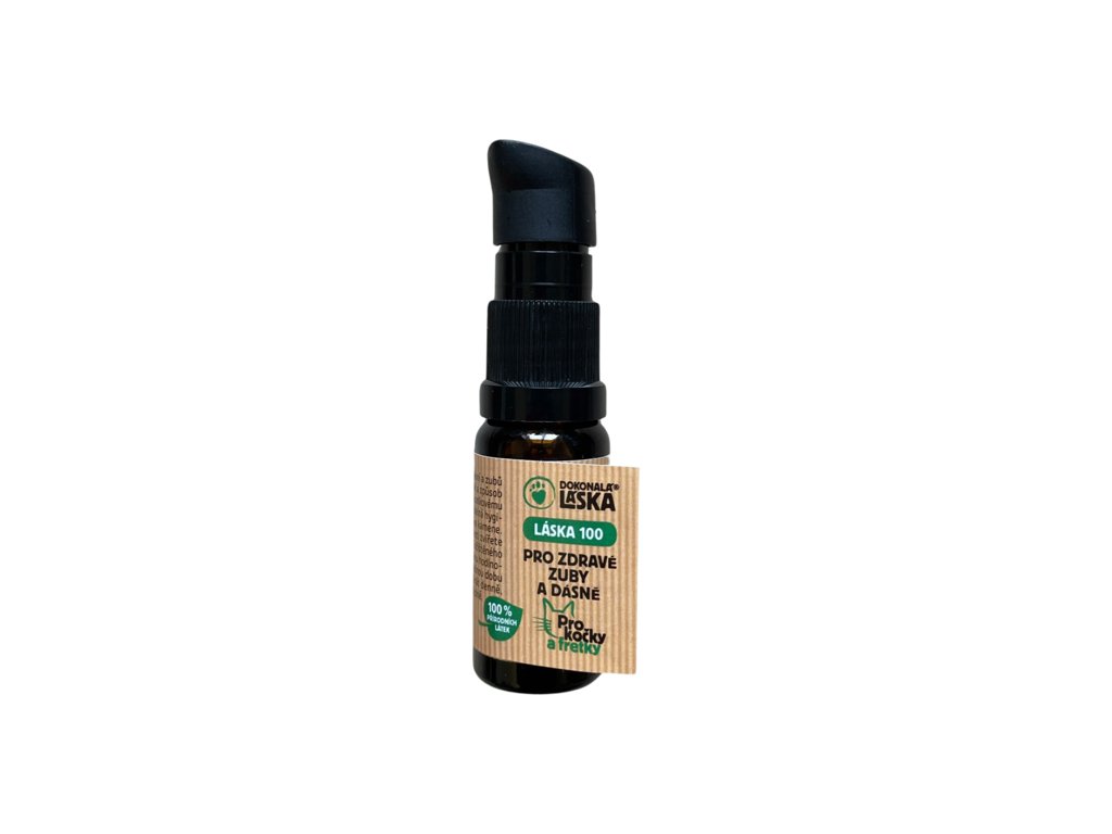 Láska 100 je čistě přírodní veterinární přípravek určený k péči o zuby a dásně fretkovitých a kočkovitých šelem. Působí příznivě na dásně a podporuje jejich hojení. Složení a způsob aplikace napomáhají správnému prokrvování dásní a tím i odstranění bolesti a celkovému uvolnění zvířete. Přípravek působí protizánětlivě, hojivě a dezinfekčně. Pravidelná hygiena dutiny ústní vede k odstranění zápachu a regulaci tvorby plaku a zubního kamene. Způsob použití: do 5kg hmotnosti zvířete jedno zmáčknutí aplikátoru. Nad 5kg aplikujte dvě dávky. Na plošku očištěného prstu nebo na gázu, popřípadě na jemný kartáček vymáčkněte dávku přípravku. Tlamu není třeba otevírat proti vůli kočky. Jednoduše zajeďte prstem pod pysky a tváře, jemně roztírejte po snesitelnou dobu (až 30 vteřin). Některé kočky vám napomohou například slintáním a olizováním. Do zlepšení stavu dásní provádějte toto 1x denně. Pro zlepšení stavu postačí 1x až 3x týdně, nebo podle potřeby.Doplňkové parametry
