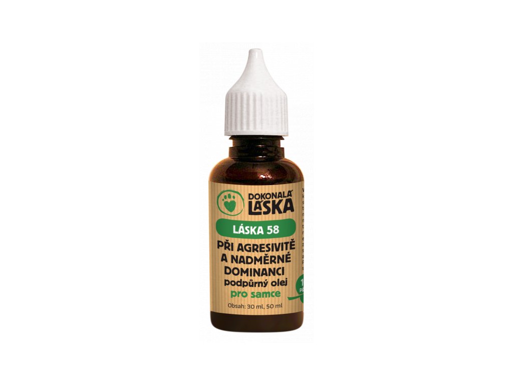 LÁSKA 58 podpůrný olej k vetření do srsti a kůže je určen pro psí samce, kteří projevují nadměrnou ofenzivní agresivitu. Pro samce s projevy nadměrné dominantní agresivity k jiným psům, s agresivním projevem likvidace konkurence a s poruchou nadměrné tvorby testosteronu. Způsob použití: aplikační dávka 1 ml (cca 40 kapek) na 5 kg hmotnosti zvířete. Potřebnou dávku 1x denně nakapejte do dlaní a vetřete na boční stranu krku, nebo do oblasti zátylky, nebo mezi lopatku či do oblasti beder a kořene ocasu. Přípravek lze také aplikovat do podpaží nebo do oblasti třísel. V případě zájmu může zvíře olíznout mastné ruce, pokud má v pořádku trávení a není citlivé na oleje.Doplňkové parametry
