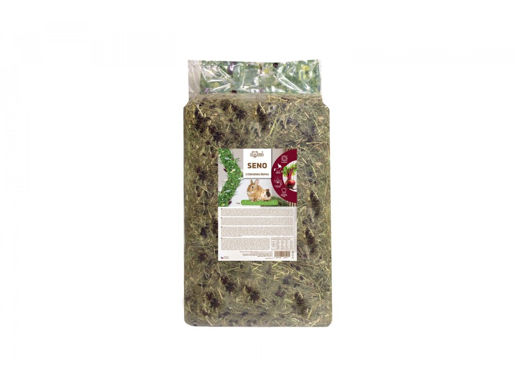 Vysoce kvalitní seno z českých luk určené ke krmným účelům, obohacené o červenou řepu, která přirozeně zvyšuje chutnost sena a zpestřuje krmnou dávku.