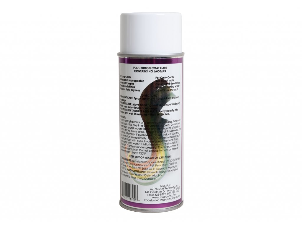 Mr.Groom, s lanolinem pěstící kondicionér pro všechna dlouhosrstá plemena a pudly. Nebarví bílou srst. Vhodný na při každodenním česání pro zachování zdravé hydratované srsti. Lehce promašťuje a příjemně voní. Návod k použití: Před použitím protřepejte. 1/ Pro péči o srst - Stříkejte lehce na celé tělo ze vzdálenosti 10 - 15 cm, pak kartáčujte nebo masírujte. 2/ Pro péči o kůži - Rukou rozhrnujte srst a stříkejte přímo na kůži, pak kartáčujte nebo masírujte. 3/ Pro rozčesání - Nastříkejte velké množství do zacuchaného místa nebo dredu, počkejte 15 minut a pak rozčesejte.Doplňkové parametry