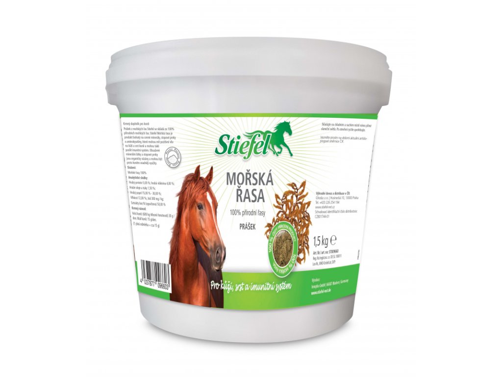 Prášek z mořských řas Stiefel se skládá ze 100% přírodních mořských řas. Stiefel Mořská řasa je produkt bohatý na cenné minerály, stopové prvky a aminokyseliny, které mohou mít pozitivní vliv na kůži a srst koně a mohou také posílit imunitní systém. Obsažené minerální látky a stopové prvky jsou organicky vázány a mohou být proto koněm snadněji využity.