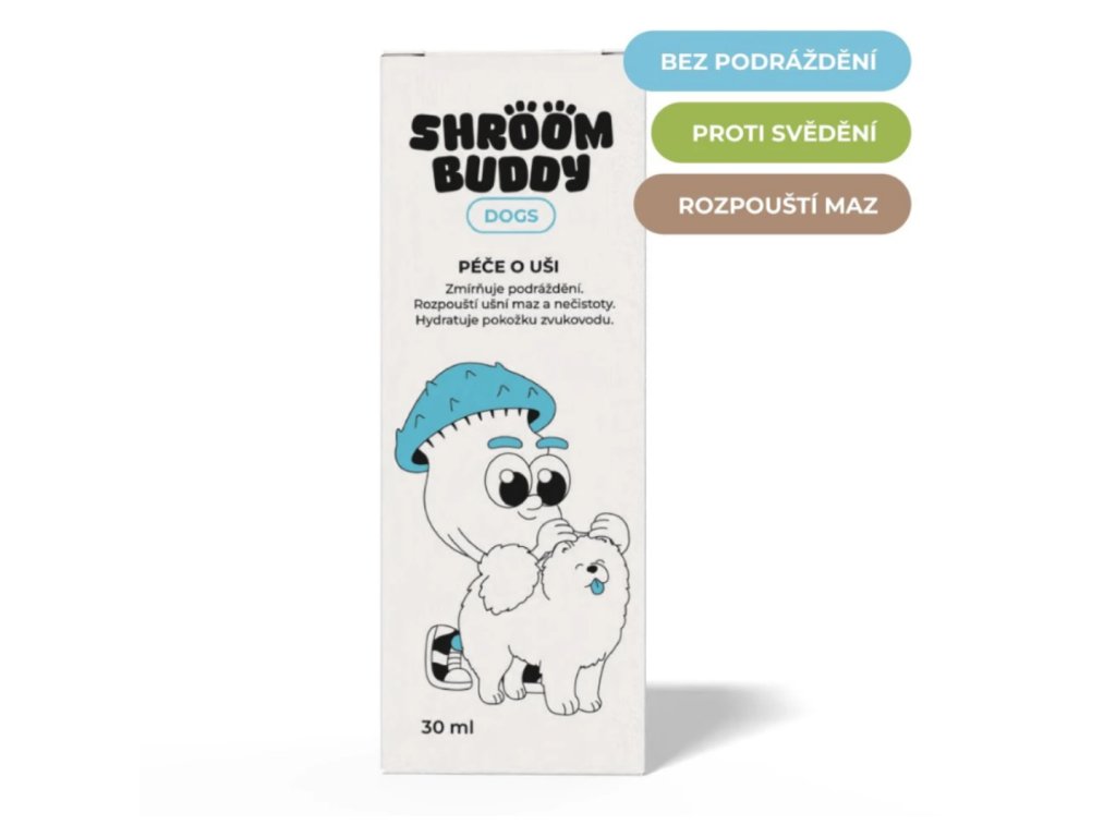 Kapky do uší pro pejsky. Přípravek slouží k šetrnému čištění vnějšího zvukovodu, rozpouští ušní maz a nečistoty a zároveň chrání před mikroorganismy. Hydratuje vysušenou pokožku a zmírňuje podráždění. Je vhodný jak pro pravidelnou prevenci, tak při potížích, například při přemnožení kvasinek Malassezia pachydermatis. Pomáhá udržovat mikrobiální rovnováhu a předchází vysušení zvukovodu. Návod k použití psích kapek do uší Obsah lahvičky důkladně protřepejte a nakapejte několik kapek přípravku do ucha. Jemně promasírujte okolí ucha, aby se přípravek dobře vstřebal. Poté ucho opatrně vytřete gázou. určeno pro všechna psí plemena vyrobeno v ČR českou firmou udržitelná a celosvětově patentovaná technologie biologický neinvazivní přípravek pro psy Složení Shroom Buddy Dog - Kapky do uší Olea Europea Fruit oil, Heliantus annuus seed oil, Pythium oligandrum in maize extract, Tocopherol natural. Jak skladovat tyto kapky do psích uší? Skladujte na suchém místě při pokojové teplotě 15–25 °C a relativní vlhkosti do 40 %. Obsah balení: 30 ml Upozornění: Veterinární přípravek – určen pouze pro zvířata. Uchovávejte mimo dosah dětí. Není určeno k vnitřnímu užití. Schválení: Číslo schválení veterinárního přípravku: 008-22/C Likvidace obalu: Obal zlikvidujte jako běžný komunální odpad – složky papír/plast.Doplňkové parametry
