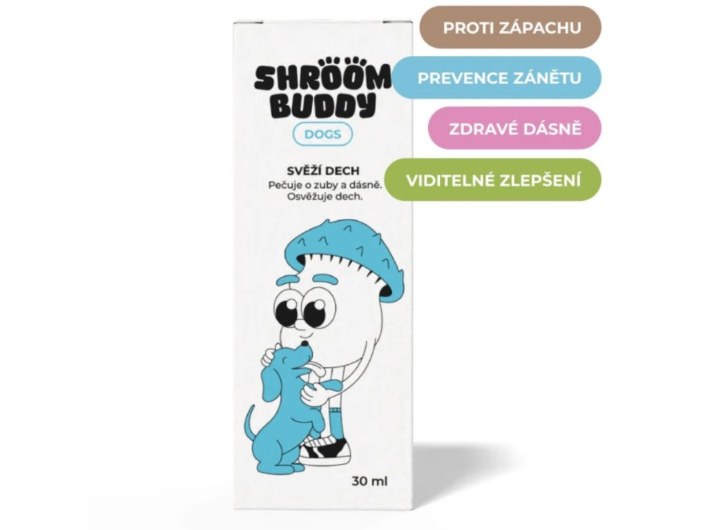 Svěží dech - přípravek pro pejsky. Přípravek působí příznivě na ústní dutinu se sklony k podráždění dásní a tvorbě zubního kamene. Pomáhá potlačit zápach z úst a osvěžuje dech. Slouží jako prevence vzniku zubního kamene a zánětu dásní, ale je vhodný i při již vzniklých problémech. Pomáhá snižovat riziko patogenních mikroorganismů a podporuje rychlejší hojení při podráždění dásní nebo problémech se zuby. Určen pro prevenci i řešení potíží. Návod k použití přípravku Svěží Dech Před použitím řádně protřepat. Přípravek lze použít nanesením na zubní kartáček či jen na prst, nebo lze nakapat do vody k pití. určeno pro všechna psí plemena vyrobeno v ČR českou firmou udržitelná a celosvětově patentovaná technologie biologický neinvazivní přípravek pro psy Složení Shroom Buddy Svěží Dech Dog Helianthus annuus seed oil, Zea mays extract, Pythium oligandrum, Tocopherol, Meat aroma Jak skladovat balzám na psí tlapky? Skladujte na suchém místě při pokojové teplotě 15–25 °C a relativní vlhkosti do 40 %. Obsah balení: 30 ml Upozornění: Veterinární přípravek – určen pouze pro zvířata. Uchovávejte mimo dosah dětí. Není určeno k vnitřnímu užití. Schválení: Číslo schválení veterinárního přípravku: 007-22/C Likvidace obalu: Obal zlikvidujte jako běžný komunální odpad – složky papír/plast.Doplňkové parametry