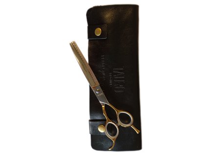 Nůžky TPL Janita Plunge line 7" (18 cm) modelovací 23 zubů ZAHNUTÉ - zlaté kroužky. Součástí nůžek je černé, kožené pouzdro. Hmotnost: 67g, celková délka (od špičky k opěrce): 19cm, délka střižné...