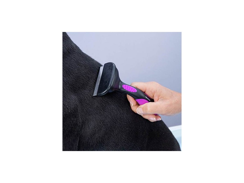 Trimovací hrablo pomáhá odstranit odumřelou srst. Dokáže snížit línání domacího mazlíčka až o 90%. Protiskluzná rukojeť pro snadný úchop. Návod k použití: Pohybujte madlem po směru růstu srsti a udržujte nůž kolmo k tělu Vašeho mazlíčka. Upozornění: Toto je ostrý nástroj! Udržujte jej mimi dosah dětí!Doplňkové parametry