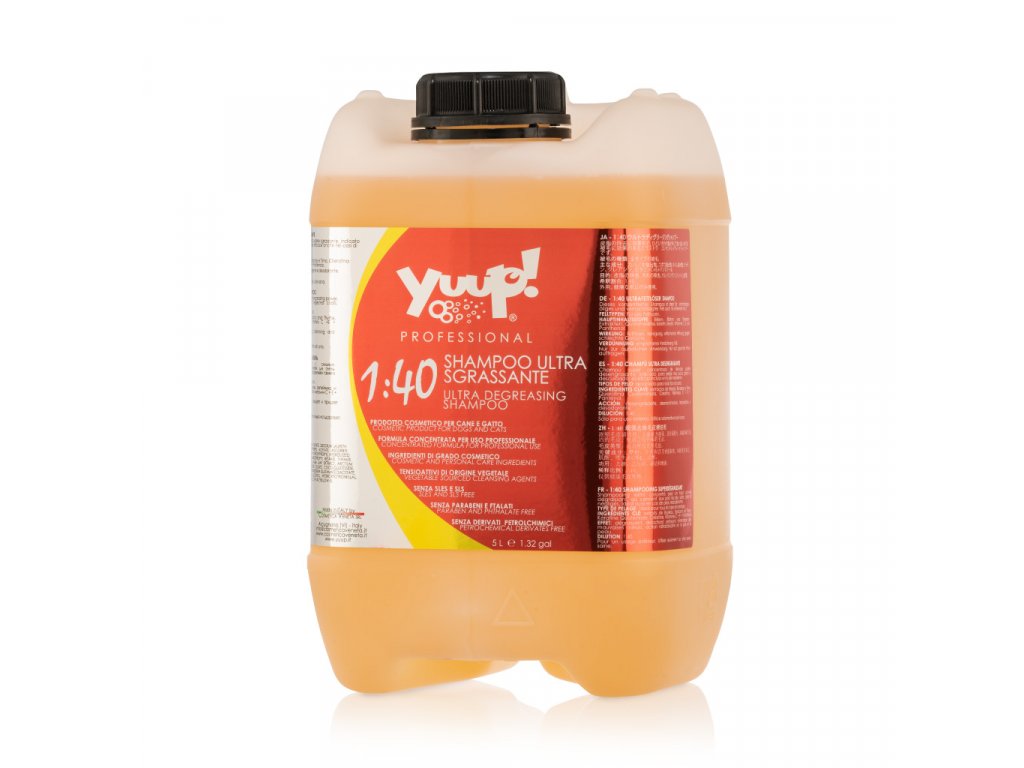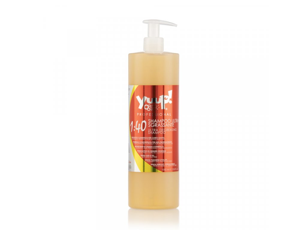ULTRA odmašťovací šampon pro psy 1:40 Yuup je extra koncentrovaný šampon s velmi silnou odmašťující silou. Obsahuje čistící složky z rostlinných zdrojů jako je bříza, lopuch, tymián, kvarternizovaný keratin, kreatin a vitamíny C + E + Panthenol . Je vhodný pro všechna plemena, textury a barvy a ideální pro odstranění mastnoty, skvrn a jako hluboce čistící péče. Kůži nevysušuje.Doplňkové parametry