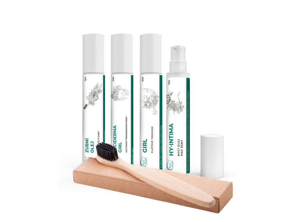 Přípravky denní hygieny v praktickém balení pro cestovatelky. Cestování může být pro pokožku náročné. Speciálně v období dospívání se na pokožce objevují nepříjmené kožní změny, i při cestování se proto nezapomínejte o svou pokožku pečlivě starat. Pro příjemné prožití cestovatelských zážitků se musí příjemně cítit i vaše pokožka. Přibalte si pleťové tonikum a lecitinový krém pro zklidnění pokožky. Na cesty je ideální zubní olej pro svěží dech. Tyto přípravky doplňuje intimní mycí olej HY-INTIMA pro šetrnou péči o intimní partie. Jako dárek obdržíte BAMBUSOVÝ KARTÁČEK splňující požadavky na ECO-FRIENDLY výrobky. Sada v organzovém sáčku obsahuje: HY-INTIMA intimní mycí olej (15 ml): Nepěnivý hydrofilní mycí olej bylinné vůně určený pro každodenní intimní hygienu žen. Mycí olej nedráždí, podporuje přirozené fyziologické funkce pokožky a sliznice. ZUBNÍ OLEJ ZE 7 BYLIN (15 ml): Kompozice rostlinných olejů vhodná ke každodenní ústní hygieně. Napomáhá snížení kazivosti zubů, zánětu dásní. Vhodný je při při výskytu zubního kamene. PLEŤOVÉ TONIKUM GIRL (15 ml): Tonikum jemné bylinné vůně s oleji z růžové palmy a meduňky lékařské napomáhá optimalizaci fyziologické funkce pokožky a tím podpoře tvorby kožního mazu. Použité složky vykazují protizánětlivé, uklidňující účinky. LECIDEDMA GIRL (15 ml): Jemný, uklidňující lecitinový krém lehké bylinné vůně pro péči o pokožku dospívajících dívek. Po aplikaci krému je pokožka jemná, vláčná, sametová, s přirozenou podporou fyziologických funkcí a symbiotické mikroflory. Vytváří zdravé prostředí pro podporu kvality mladé pokožky.Doplňkové parametry