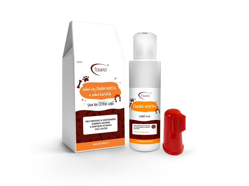 Pro prevenci a odstranění zubního kamene a dentální hygienu psů i koček. S kvalitním silikonovým kartáčkem. Mechanické čištění zubů je u psů a koček nenahraditelné. K tomu jsou ideální jemné silikonové kartáčky. Ve výhodné sadě se zubním olejem FAUNA DENTOL objevíte kvalitní kartáček od firmy Beaphar. Zubní olej vhodný pro odbourávání zubního kamene a k omezení jeho vzniku. Je vynikající svým působením proti vzniku dentálních onemocnění. Použité esenciální oleje z mateřídoušky, rozmarýnu a máty kadeřavé v základu ze slunečnicového a olivového oleje jemně a důkladně ošetřují ústní dutinu. Při pravidelném používání může docházet k vymizení problémů s dásněmi, k omezení tvorby zubního kamene nebo k rozpadu toho již vzniklého. Veterinární přípravek schválený ÚSKVBL (063-14/C).Doplňkové parametry